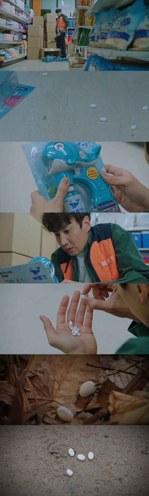 쏟아진 버블건에서 익숙한 알약들이 함께 쏟아진 걸 발견하고,