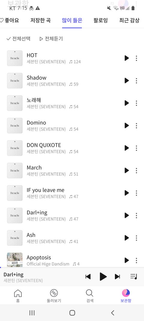 세븐틴 노래 너무 좋아서 벌써 이만큼 들었어 ㅋㅋㅋㅋ 내 최애곡은 도미노랑 마치랑 잎유립미랑 노래해랑 달링이야 정말 좋은 앨범 가져왔더라 진짜 좋아