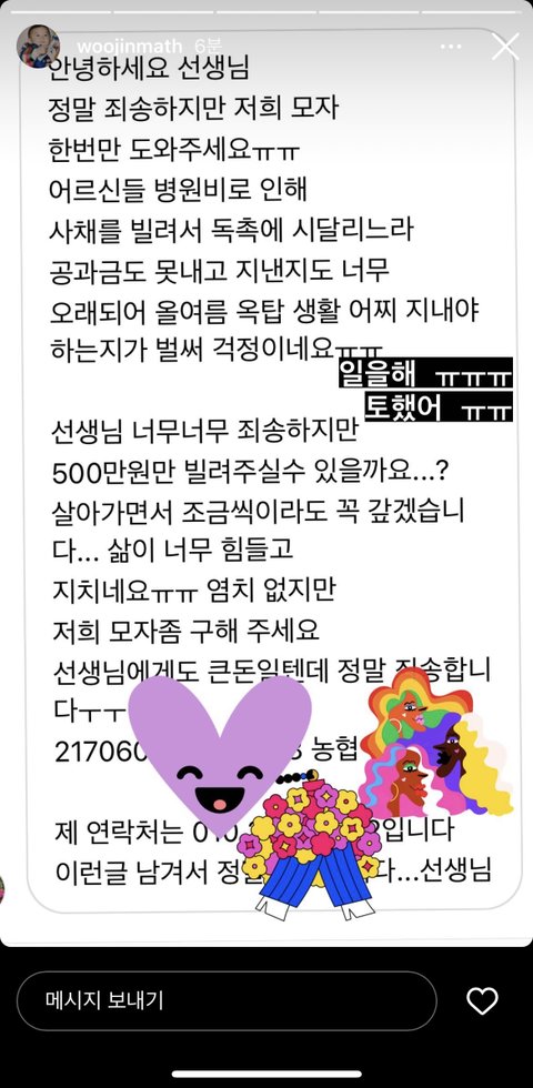 나 서른인데 내 나이쯤 관점에서 만약 저 강사분이 나라면... 저런 디엠이 계속 오는걸 무시하고 앉아있는것만으로 버거워 제동이 필요하긴 할테니, 그냥 일면식 없는 분들의 개인적인 금전 요구 디엠이 너무 넘쳐나 버겁고 힘들다, 자제 바란다 이렇게 차분하게 글 올리거나 했을것같긴해. 일을해~이런 글...글쎄, 내가 20살 혹은 25살이였으면 저렇게 쓸수있어. 이상한것도 아니고, 돈 요구하는 염치없는 사람들이 더 잘못된게 맞어. 근데 저게 저 나이대의 대응은 아닌것같긴하다. 한없이 가벼워보여 사람이.