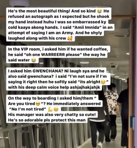 외국인 아미가 경유 대기하면서 뷔한테 사인 부탁했는데 사인 못해주는 대신 손 잡아주고 조카 친절했다네요 ㄷㄷ;;;