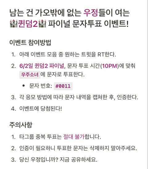 염치를 불구하고 오늘 10시에 퀸덤 파이널에 우주소녀가 출연하는데 #0011로 우주소녀 투표 해주신다면 진짜 감사하겠습니다ㅠ