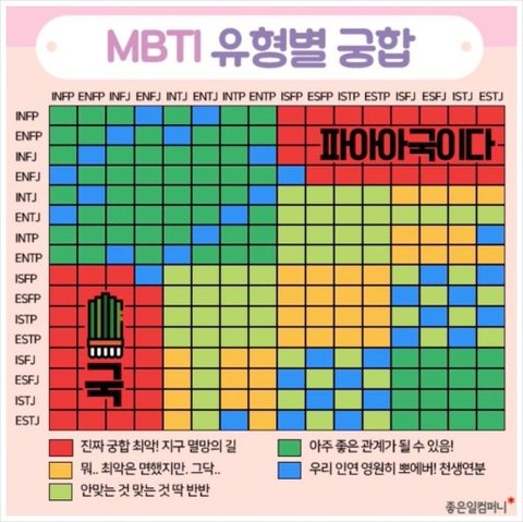 istp랑 esfj랑 천생연분이라고 궁합표 보면 그렇게 되어있던데 왜그런거임? 아무리봐도 한 명이 일방적으로 상처받는 관계 같은데(나 잇팁임)