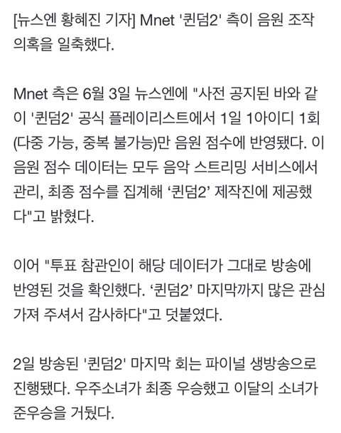 얘들아 퀸덤 2 음원 조작 아니라고 기사 나왔어. 남이 힘들게 얻은 결과물을 그렇게 쉽게 깎아내리지 말자. 스포티파이 측에서 넘겨준 정보로 점수 환산한건데 진짜 조작이면 스포티파이쪽이 엠넷을 고소하겠다. 정확하지 않은 정보들로 선동하지마.