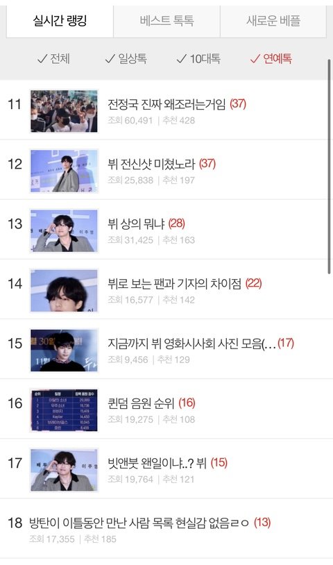 나 원래 방탄 관심 1도없었는데 요새 뷔 연애부터 시작해서 얼굴빠는글 끝도없이 올라와서 진짜 개빡침. 아니 한두번이어야지 그냥 넘어가지 톡을 도배를 하네. __아미충들아 느그 오빠들 욕 덜먹게 하고 싶으면 입닥치고 팬톡에서나 실컷 빠렴.