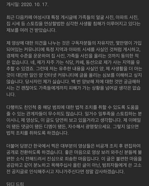 유튜버 딤디 가족, 집 위치 등등 신상 털어서 유튜브 커뮤니티에 박제됨.