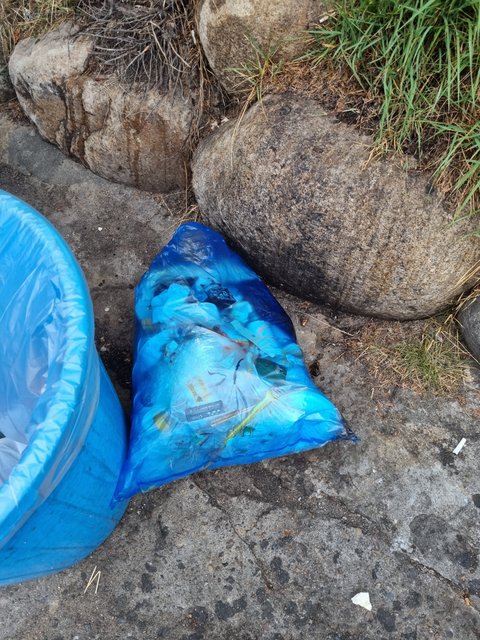 파란색 쓰레기 봉투에 이것 저것 섞인 쓰레기 봉투를