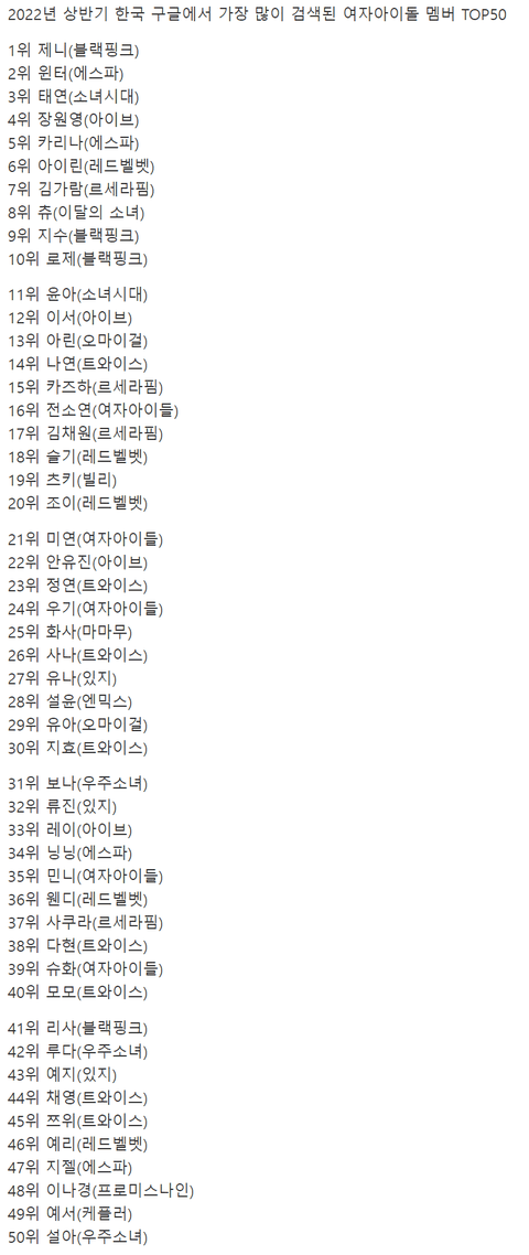 블랙핑크, 제니, 아이브, 장원영, 에스파, 카리나, 소녀시대, 태연