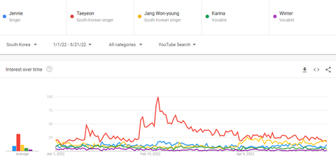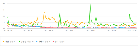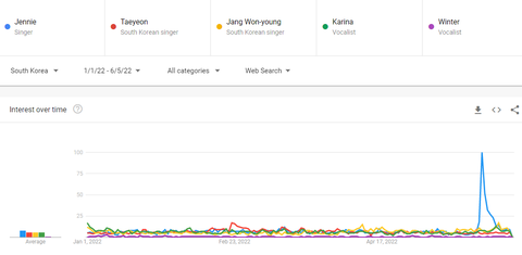 네이버 검색량 (제니는 뺐어, 최근 열애설로 그래프를 파괴해버려서)