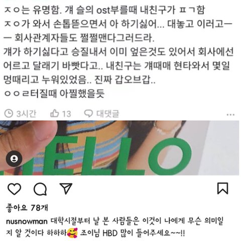 이게 ㄹㅈㄷ 개웃기지 않냐 슬의생 편곡한 사람이 내 친군데 조이 때문에 스트레스 어쩌고 저쩌고 했는데 그분 인스타에 조이 솔로곡 홍보글 올리셨었음ㅋㅋㅋㅋㅋ 진짜 주작을 할거면 좀 알고라도 하던가