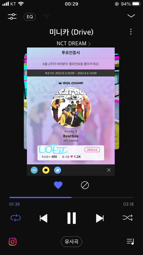 기껏 음원 다운 열심히하고 스밍 열심히 했는데 투표로 따일 순 없잖아 솔직히 음원도 그닥 우세한건 아니라 투표로 뒤집어 엎으려 해도 모자라