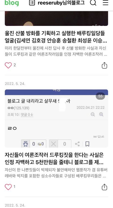 몇년간 민주당을 위해 여론조작과 청부업을 해온 성소수자 무리가(웹툰작가 겸 유튜버 레바,보배드림 취임식 수류탄 테러글 올린 수류탄남인 웹툰작가 박지 윤석열과 김건희 자택 테러글을 올리고 잡혀간 여장갤 고닉 설담, 이들과 함께 모든 일들을 기획한 유튜버 유우키의 일본이야기 포함) 사전선거 조작 및 부정선거를 덮기위한 시선끌기용으로 울진에 미리 한달전부터 사전 답사를 다니며 준비한 끝에 2022년 3월 4일 오전 11시 17분경에 일부러 산불 방화를 함(미리 사전 답사 후 방화를 했다는 자백, 드루킹짓 했다는 자백있음) 이들의 얼굴과 신상을 울진방화범 얼굴이라 올린 글을 최근들어 블로그 글을 내리라고 협박과 돈으로 매수하려는 시도를 계속해서 하더니 네이버뉴스 및 온갖 커뮤니티에서 조작 드루킹짓을 하는 무리답게 수백개의 아이디로 방화범들의 얼굴을 올린 글을 청소년 유해 게시물로 신고를 넣어 글을 내려버림 해당 증거들과 함께 울진산불 방화범들의 얼굴을 새로 글 파서 올렸으니 꼭 봐주세요 오랫동안 엑소와 방탄 팬코 악플러짓을하며 괴롭혀 오다 이번에 빅히트에 1500만원 벌금 고소당한 사람이 바로 울진 산불 방화범 얼굴글에서 첫번째 두번째 사진 속 사람임