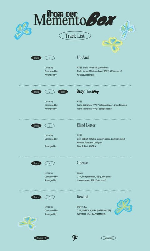 타이틀곡 ‘Stay This Way’ : ‘DM’(디엠), ‘WE GO’(위 고) 등을 작곡한 이우민 “collapsedone”과 ‘Feel Good (SECRET CODE)’(필 굿)을 작사한 서지음