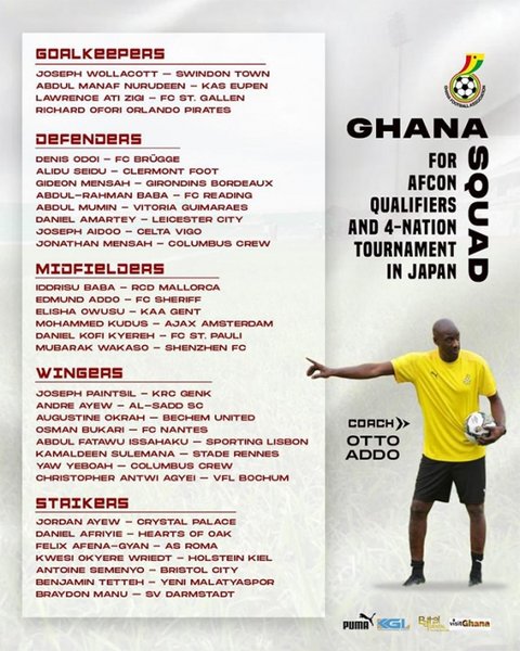 - 미드필더 : 이드리수 바바(마요르카/스페인) 에드문드 아도(셰리프/몰도바) 엘리샤 오우수(헨트/벨기에) 모하메드 쿠두스(아약스/네덜란드) 다니엘코피 체레(장크트 파울리/독일 2부) 무바라크 와카소(선전FC/중국)