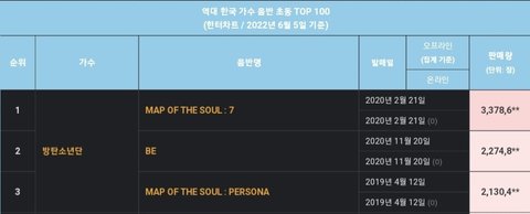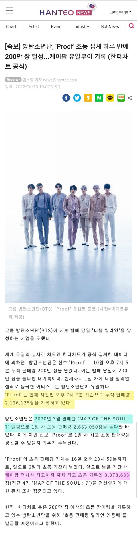 요즘 음판 임플레 너무 심해서 랜덤포카에 팬싸에 주얼에 온갖 상술도 오지고 웬만한 1군 2군돌도 백만장은 흔하게 팔아서 방탄은 컴백하면 어느 정도 될까 솔까 궁금하긴 했음 1종이고 가격도 넘 비싸서 하이브가 성적은 포기했구나 했더니 6시간만에 2백만장이라니? 내가 아미들을 너무 얕잡아봤네 ㅋㅋㅋㅋㅋ