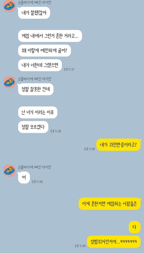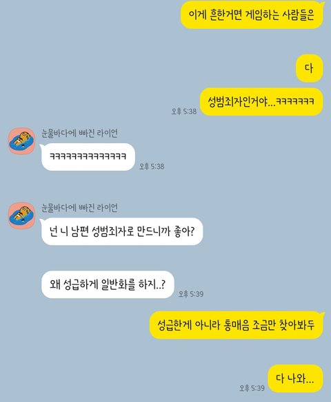 처음에는 왜 그러냐고 그냥 게임만 즐기자고 했는데 점점 수위가 높아지고 보는 저 조차도 기분이 솔직히…더러웠습니다