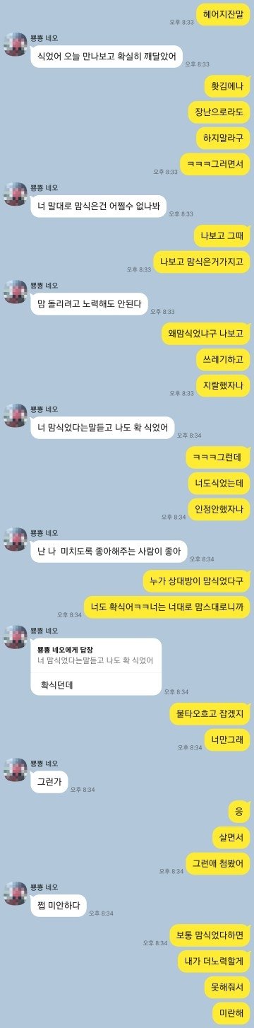 그뒤로 3일뒤 여느때처럼 만나기로함(이때가 헤어진날)이날은 만나기전부터 아침에 톡으로 보고싶다라하고 제가 안나온다해도 나오라고해서 나갔는데 동태눈깔에 주머니에 손넣고 버스에서도 따로 앉는거 그뒤로 위에만난것처럼 노래방만 갔다가 각자 집갔는데