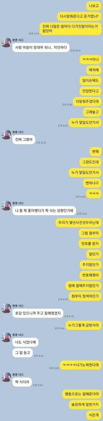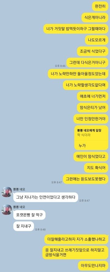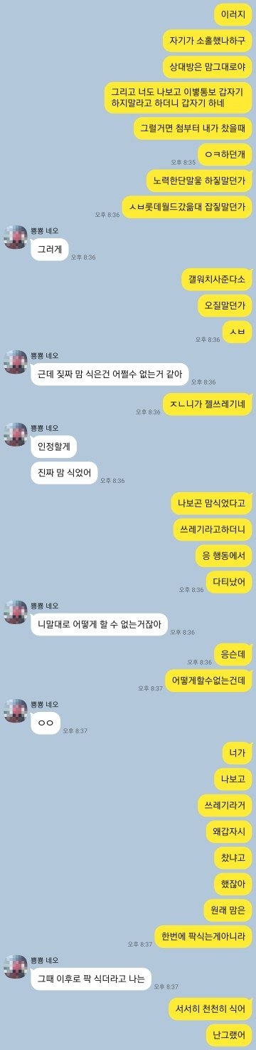 전남친 : 난니가 권태기라고 하니까 당황스러워서 그얘기 듣자마자 팍식네 그래 헤어지자