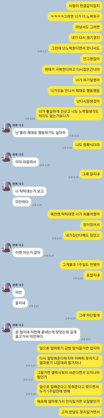 전남친 : 사실 1주일전에 너가 권태기라고 헤어지자했을때 그말듣고 맘이 팍식어버렸고 그때 그냥 안잡고 보냈어야 했는데 미안하다