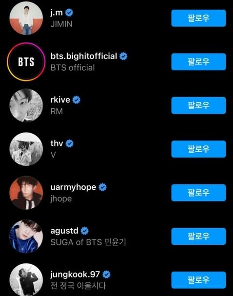 인스타 프로필 저게 먹힐거 같냐 ㅋㅋㅋㅋㅋ 멤버들 다 활동명 영어로 맞춘거고 정국이만 최근에 바꾼거에다 멤버들 흑백플필도 여러갠데 그럼 RM이랑 V 럽스타임?ㅋㅋㅋㅋㅋ