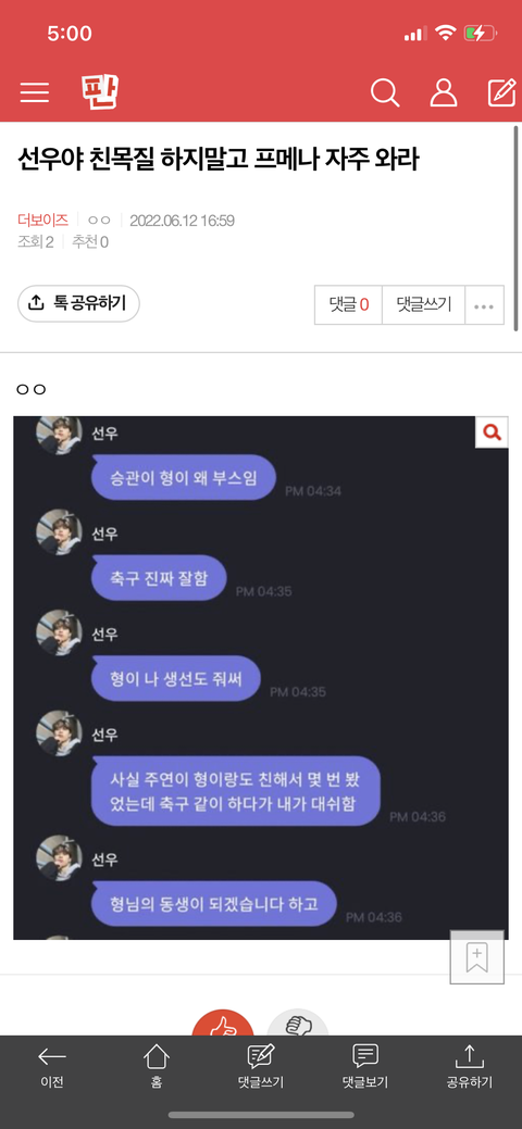 선우야 친목질 하지말고 프메나 자주 와라
