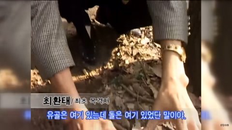 근데 영상에서 목격자는 넓적한 돌에 앉아서 쉬고 있는데 유골은 나무 옆에 있었고, 넓적한 돌을 드니까 신발이랑 옷이 나왔다고 했습니다. (신발이랑 옷을 누른 넓적한 돌에 앉으면 돌이 좌우로 흔들렸을 테고 그래서 목격자가 돌을 들쳐봤을 겁니다.)