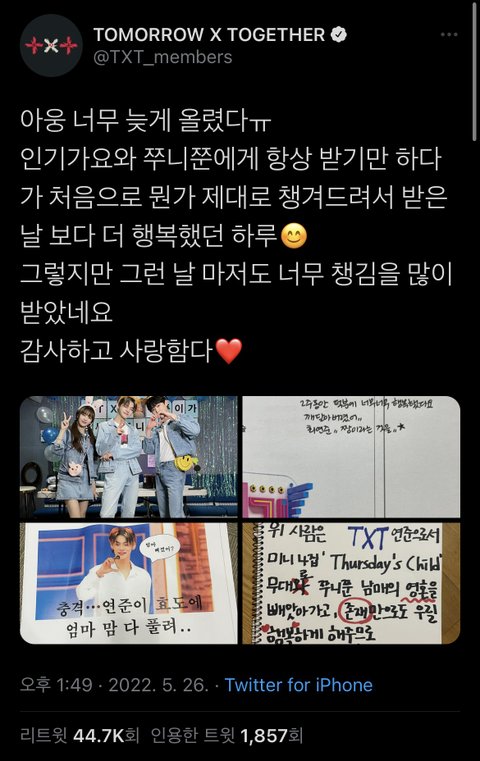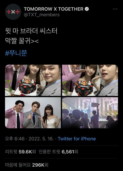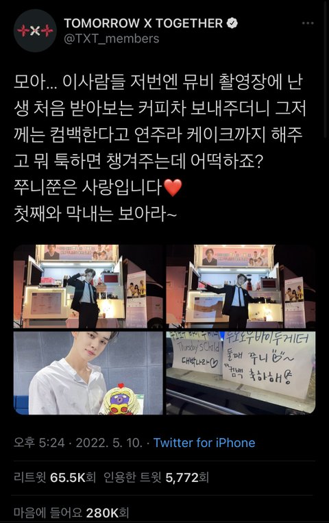 심지어 엠씨한지 2~3주 만에 투바투 뮤비 촬영장에 커피차 보내줬어 3명이서 친하게 지내는 모습 너무 좋다