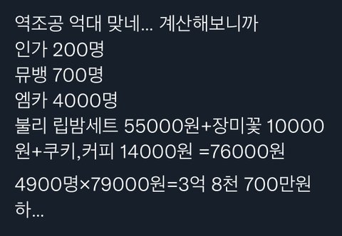 대량으로 사서 원가보다는 싸게 샀어도 최소 3억은 넘겠는데 ㄹㅈㄷ