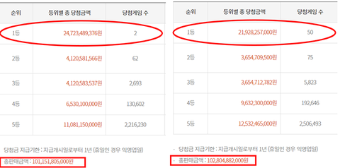 지지난주에 1등 2게임 당첨으로 게임당 당첨금이 120억이 나왔기에,