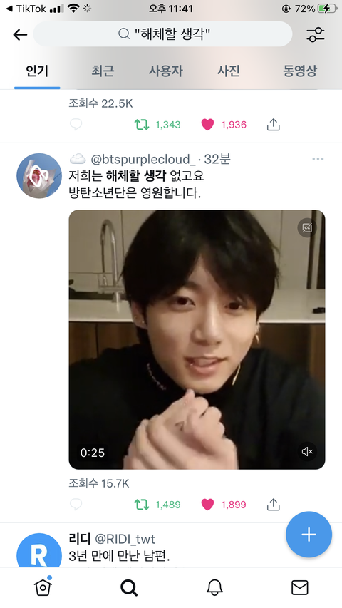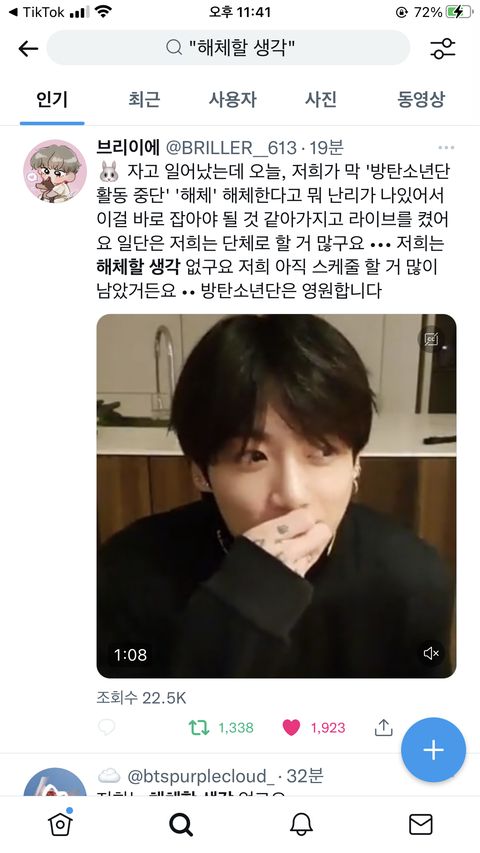 정국이가 브이앱에서 직접 방탄 해체할 생각 전혀 없다고 할거 많다고 말했음 다들 ㅅㄱ해라 해체라고 떠들어 대던것들 여기서도 박박 우겨봐ㅋㅋㅋㅋ 아 속 시원하다ㅋㅋ