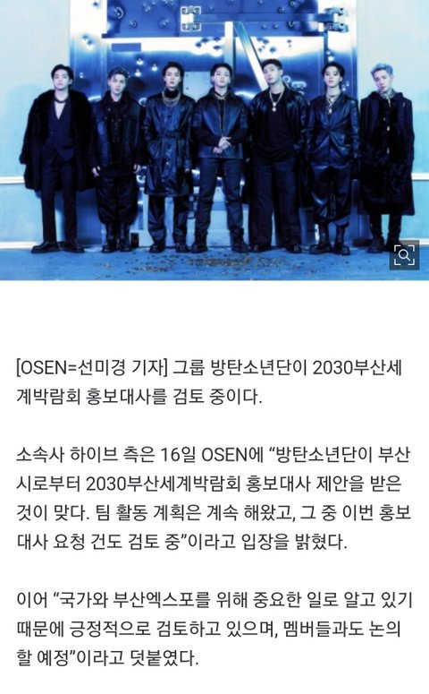 아직 확정은 아니지만 부산시로부터 2030 부산세계박람회 홍보대사 제안 받았대ㅋㅋㅋ