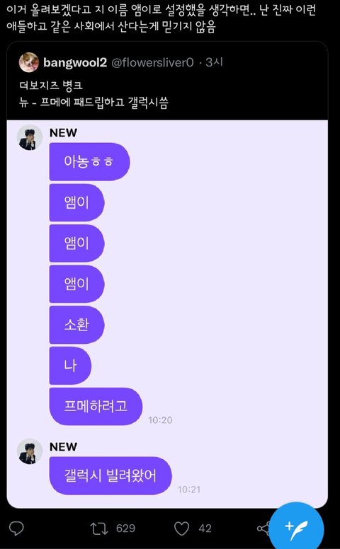 트페미들 뉴가 뭔 도화살 잇어서 어쩌구 하는데 지들이 개ㅂㅅ인걸 뉴탓하고 잇어ㅋㅋㅋㅋ