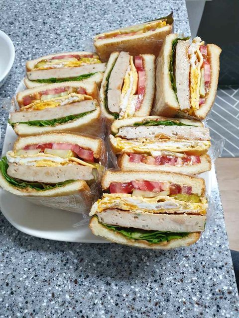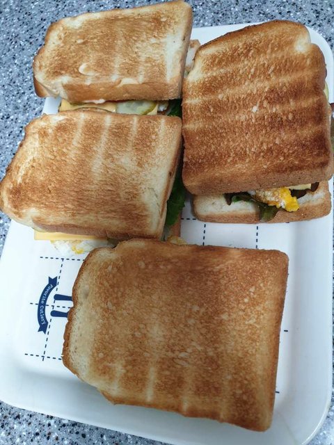 양상추 넣고 닭가슴살 패티 계란 오이 치즈 토마토 등 재료를 넣고 칠리소스 바르고 마요네즈 바르고 덮으면 끝.