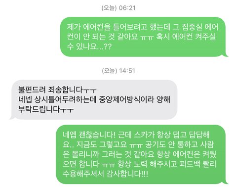 우리 스카는 에어컨을 10분 이상 안 틀어줌 ㅅㅂ 요즘 날씨 시원하다지만 스카는 공기도 안 통하고 환기도 못 시켜서 에어컨 트는 게 맞는 거 아니야? 나만 이상한 사람 같음 스카에서 땀 뻘뻘 흘리면서 공부 하는 것도 짜증 나고... 오늘 내 친구 스카에서 마주쳤는데 물어보니깐 걔도 좀 덥다더라