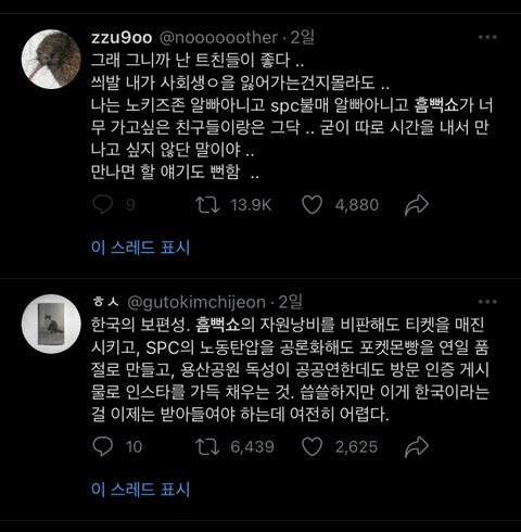 근데 맞는말 아님? 전국 각지의 강이 말라서 땅이 쩍쩍 갈라지고 있는데 그저 좋다고 흠뻑쇼 예매하고 자랑하고, 노동자들이 목숨 걸어가면서 spc에게 기본적인 권리를 요구하는데 포켓몬 빵 그게 뭐라고 난 신경안써~ 마인드고… 사람들이 자기가 피해보기 전까진 아예 무관심한거 사실이잖아 다른 쪽에선 사람이 어떻게 되든 말든