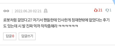 그글 베플 찬반 조작보면 재현한테 외국인이 말안걸었다고 날조로 패던데 정작 영상보면 영어 잘하는 재현이 송강 영어로 외국배우들한테 소개시켜주고 같이 얘기하고 다 했음ㅋㅋ날조 아니면 못까냐? 그리고 송강이랑도 계속 대화하던데 자기최애 못내세우니까 배우방패쓰기 ㅠ 역대급 추함 패션쇼보면 정재현 외국인들이랑 잘만 얘기하고 사람들 몰려와서 대화함