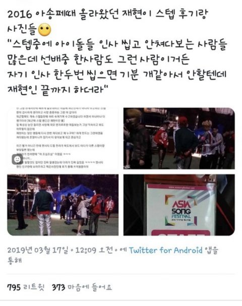 선풍기로 까는것도 웃긴게 원래 몸도 패션쇼 메이크업해서 메이크업때문에 스텝들이 선풍기 손에 들고 말리는건데 재현은 스텝 고생 안시키려고 자기가 옷말린거임 (그전에도 선풍기 든 스텝 들어준적 있음 무슨 갑질한것도 아니고 하다하다 이걸 까냐?ㅋㅋ)