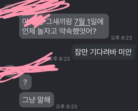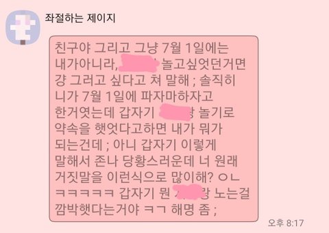 ㅇ이래놓고 친구야 그냥 그때 걍 a랑 놀고싶은거면 쳐 말해 ;;너 원래 기억력이 붕어냐 등등 욕을 하더라구요...그래서 제가 못 믿겠으면 a한테 톡 넣어바라고 하니까 b가 야 너네 둘이 짰냐 ? ; 라고 해서 제가 캡본 보여주까?라고 하니까 됏어 ; 라고 해서 왱?라고 하니까 됏다고 ; 굳이 봐야해?라면서 1일 뒤 a한테는 웅웅 ! 7월1일에 놀수잇엉?이러면서 태세전환 하더라고요 ...?