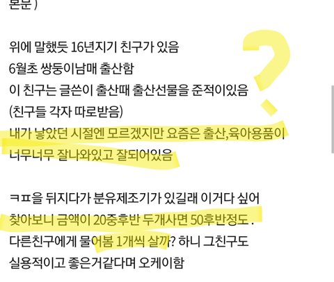 요약 : 친구가 쌍둥이 낳아서 다른친구랑 분유포트를 2개선물했더니 현금주지 왜 이걸주냐는 소리들었다
