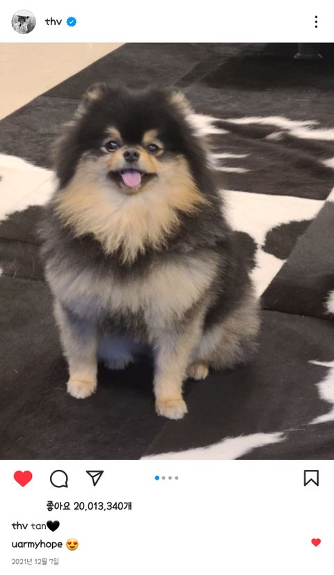 방탄소년단 뷔 반려견 연탄이 사진이 아시아 최초이자 유일한 게시물이고 현재 인스타그램 역사상 가장 많은 좋아요를 받은 게시물 세계 18위