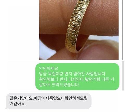 사이즈 때문에 제작 후 택배로 보내거나 직접 저희 집 앞으로 밤 10시 넘어서 가져다주는 게 가능하다고 그 시간에 가져다주신다고 하더라고요.. 아무래도 고가 상품이다보니까 택배 보다는 직접 받는게 안전할 거 같아서 감사하다하고 밤 10시 넘어서 받았는데 어두워서 밖에서는 자세히 확인을 못하고 집 와서 다시 확인해보니 디자인이 너무 달라서요.. 색도 금은방에서 본 거는 완전 골드색상인데 받은 반지는 골드도 아니고 실버도 아닌 애매한 색상이에요.. 근데 똑같은 상품이 맞다고 바득바득 우기면서 인정을 안해요ㅜ(문자로 비교사진 보내줬는데 같은 디자인이 맞다고 합니다.)
