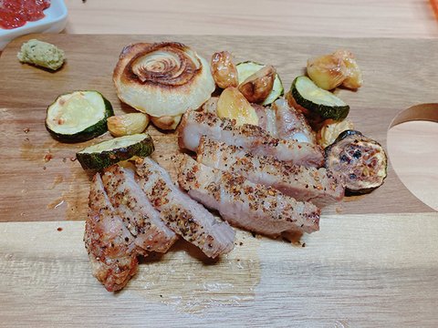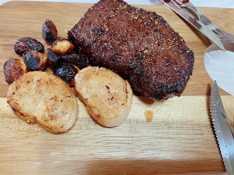 육식맨 유투브 보고 에프에서 저온으로 속 익혀서 겉은 센불에 빠르게 익혀냈더니 넘나 굿..부드러워 이 없어도 먹을수있어요