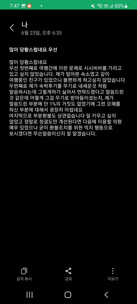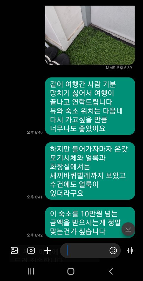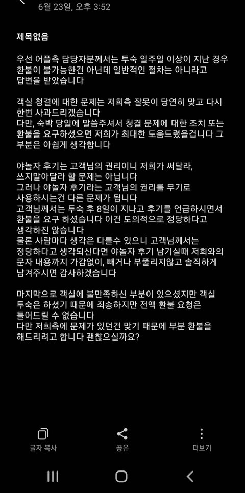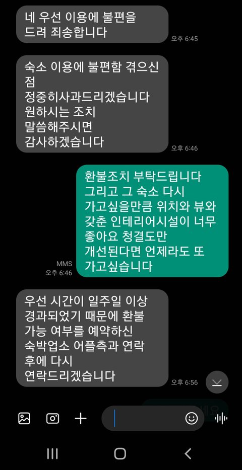 그 뒤로 일주일이나 여행이 계획되어있기 때문에 같이 여행간 사람은 바퀴벌레까지는 못봤으니까 앞으로의 여행을 망치기 싫어서 쉬쉬하며 여행을 끝마치고 와서 숙소로 문의를 넣었으나 이런 답변이 돌아왔습니다