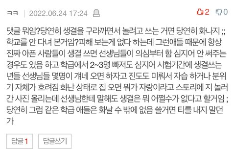 +) 남한테 관심 끄라는 애들은 뭐임? 나한테도 피해오니까 그렇지 우리 학급 수 적어서 시험 전에는 진짜 수업 8명에서 해본 적도 있음ㅋㅋ 그러면 진도도 못나가고 수업도 어영부영됨 ㅈㄴ 민폐고 한명이 그렇게 분위기 한번 곱창내면 다른 애들도 ㅈㄴ 씀;; 그리고 생결 존재 이유가 1달에 쉬는 날 하나 더 만들어주려고 있는 거임? 아픈 애들 배려해준 거잖아 그걸 악용하고 뭔 상관이냐 이러는 애들은 그냥 ㅈㄴ 이기적이라고 생각함