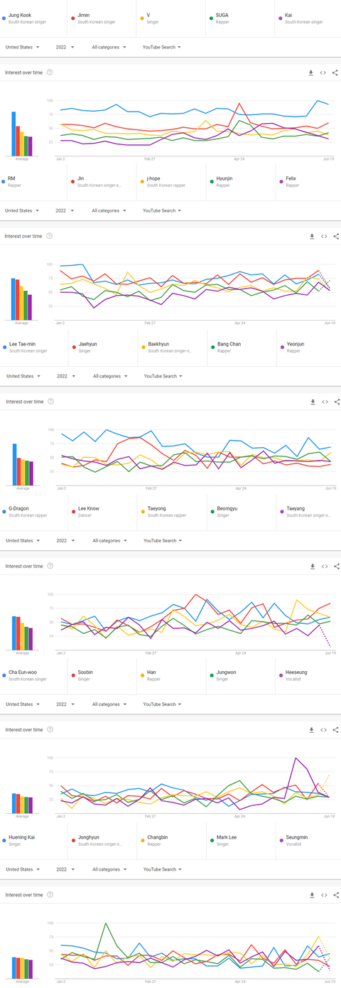 2022년 상반기 미국 유튜브에서 가장 많이 검색된 케이팝 남자아이돌그룹 멤버 TOP30