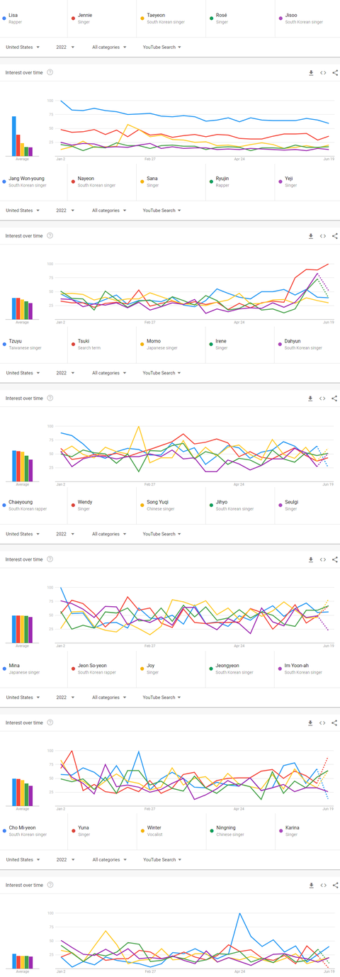 2022년 상반기 미국 유튜브에서 가장 많이 검색된 케이팝 여자아이돌그룹 멤버 TOP30