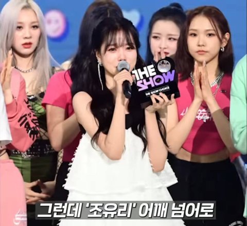 조유리 1위 받을때 라잇썸 정색한 표정 지음