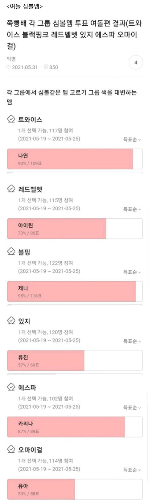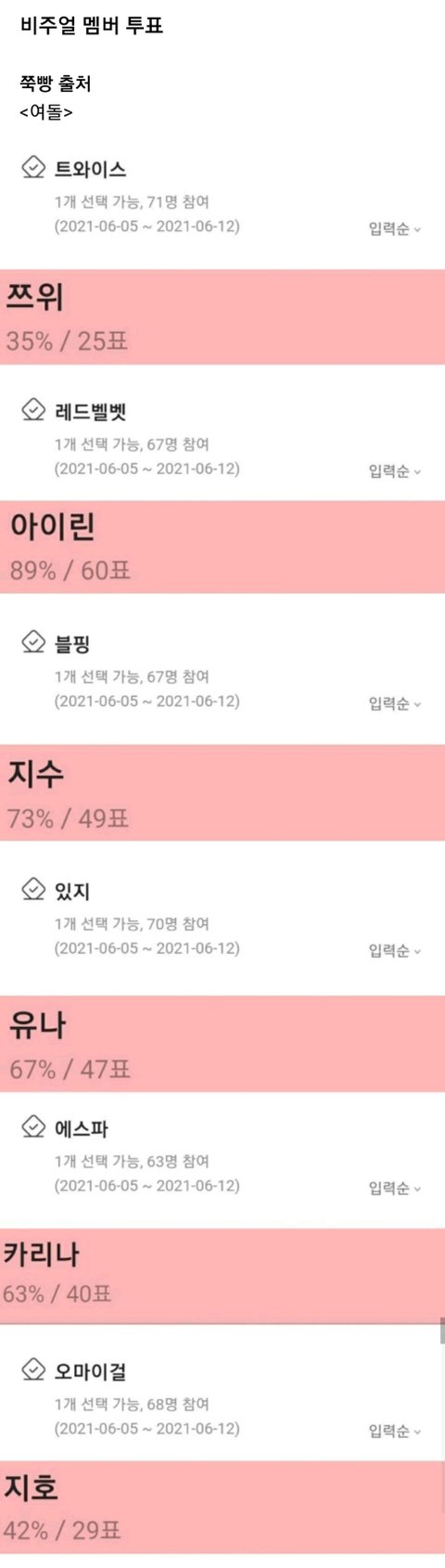 쭉빵 여돌 비주얼 투표(표본 너무 작아서 빼려다 겸사겸사 넣음)