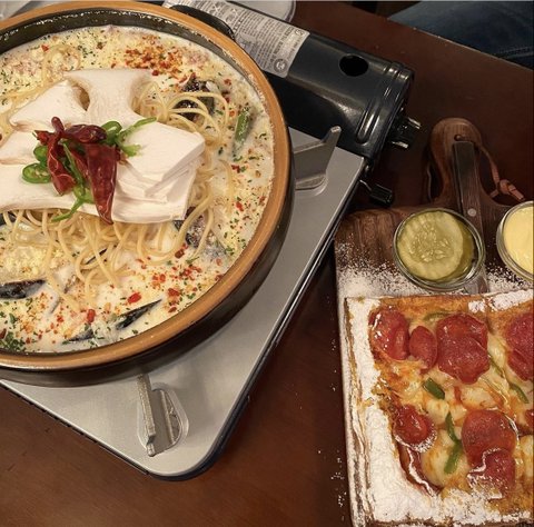 제가 가면 꼭 시키는 금별조합 보글보글 끓이면서 먹는 파스타 아주 별미에요 따뜻하게 계속 먹을수있어서 최고