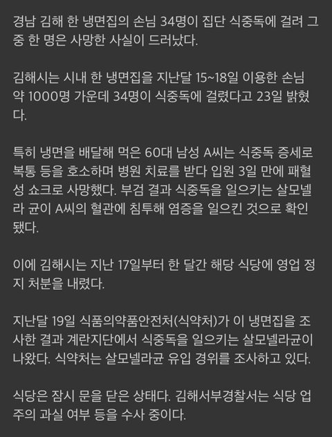 경남 냉면집서 34명 '집단 식중독'..배달손님 1명은 사망