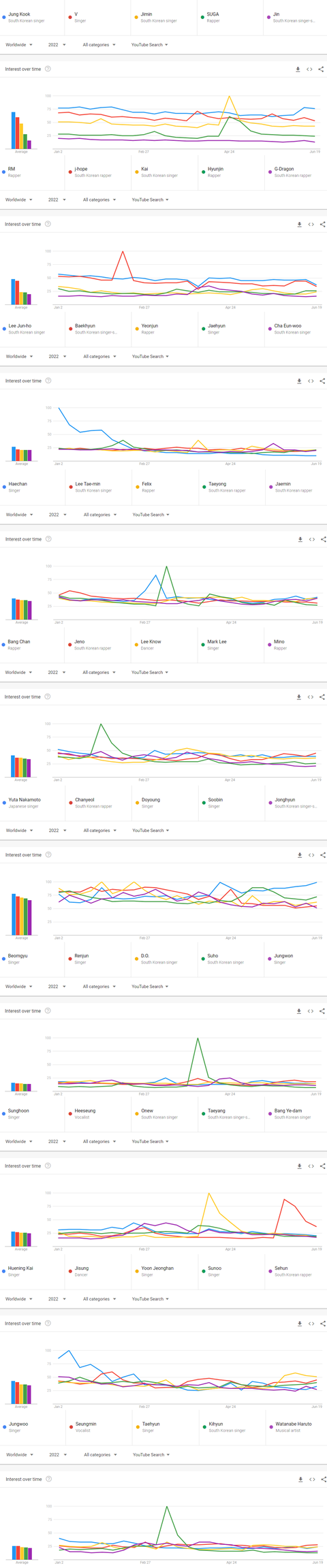 2022년 상반기 전세계 유튜브에서 가장 많이 검색된 케이팝 남자아이돌그룹 멤버 TOP50